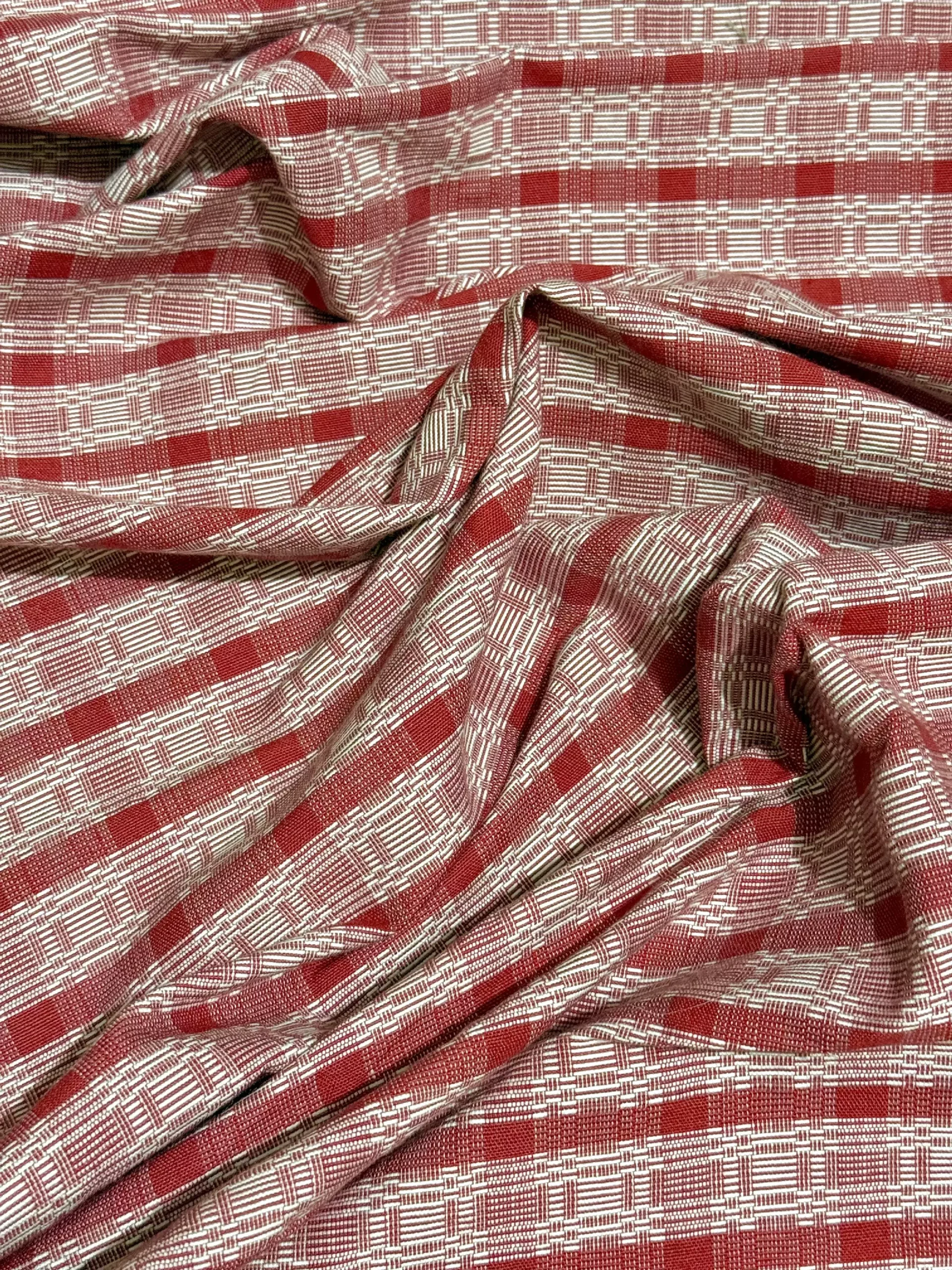 Woven by artisans in the northern Philippines, this Binakol fabric features a mesmerizing optical illusion pattern in red and white. Traditionally used in blankets and garments believed to ward off evil spirits, Binakol is known for its intricate geometric design and symbolic meaning.
