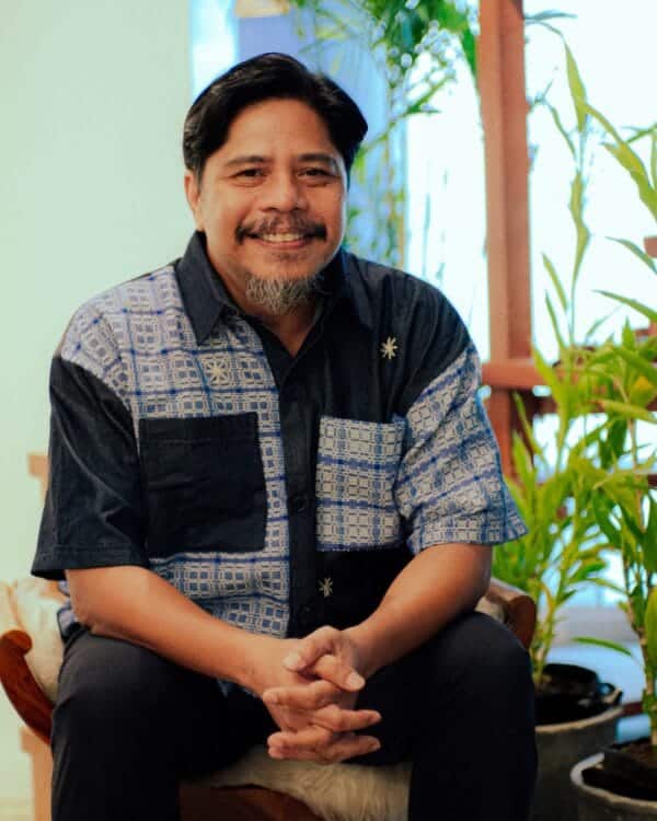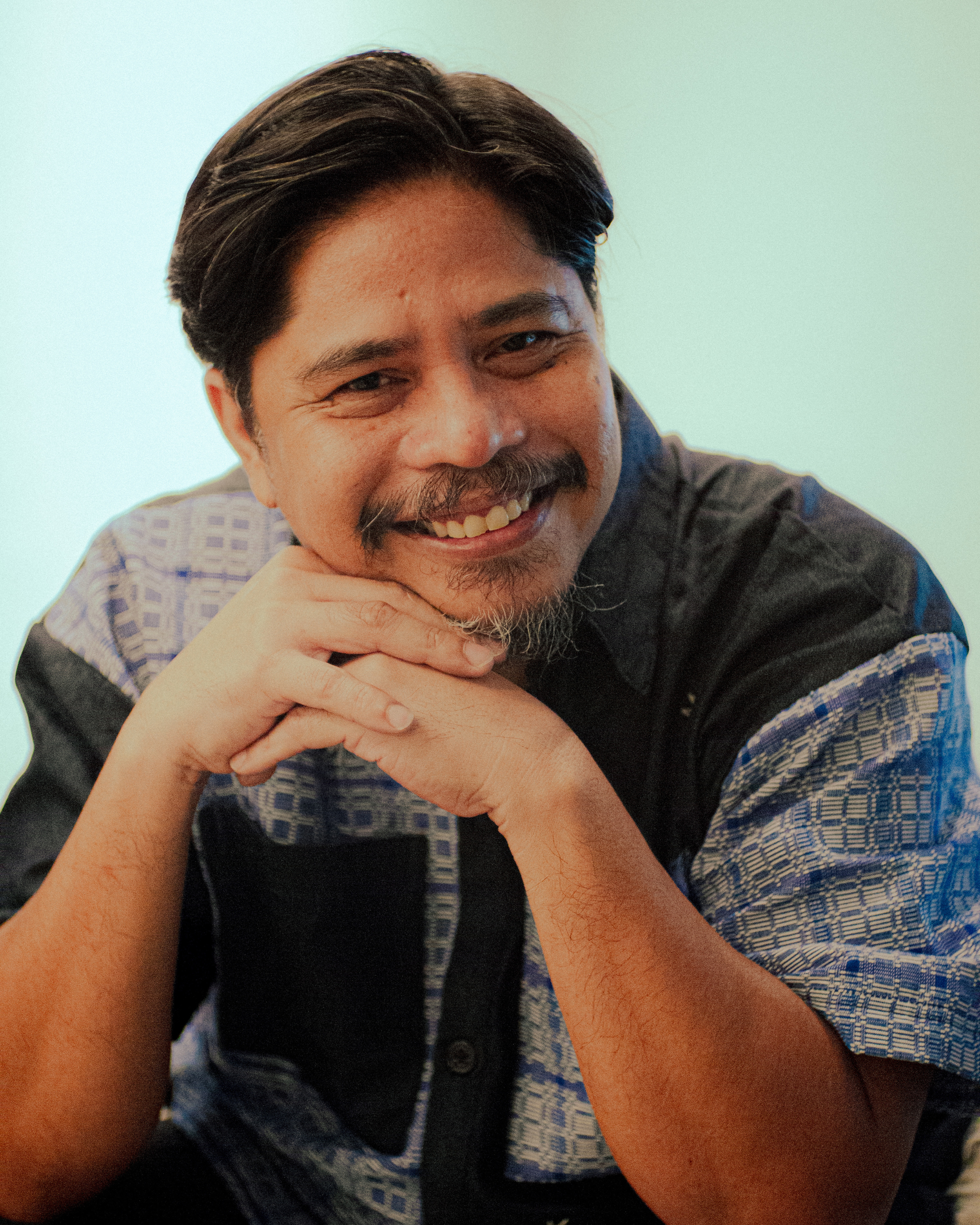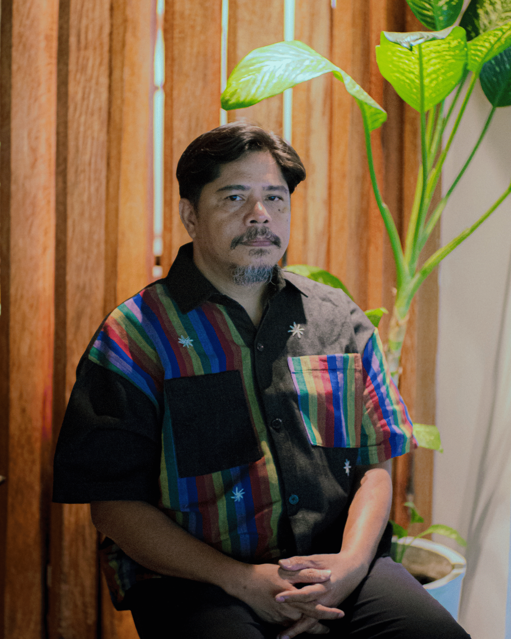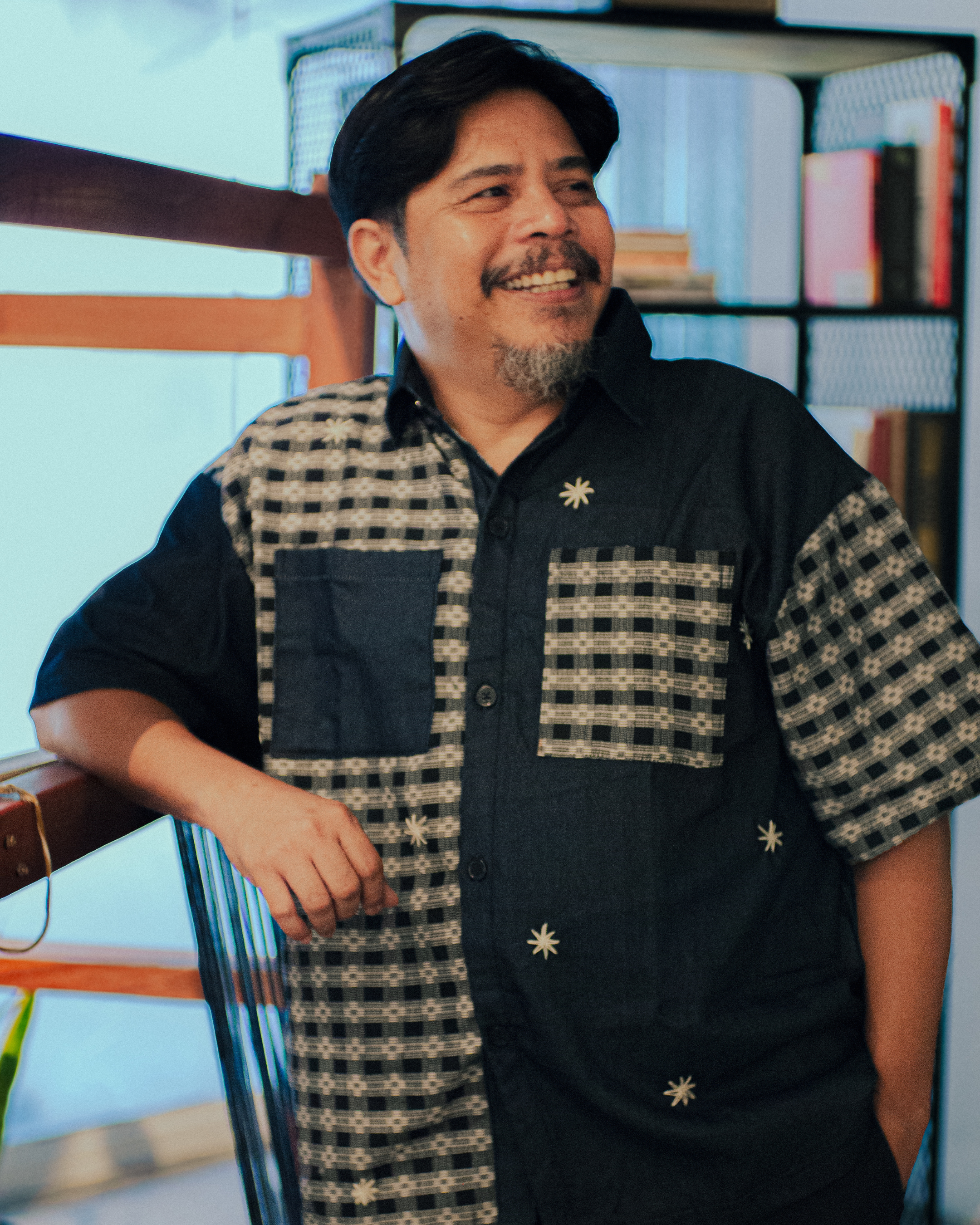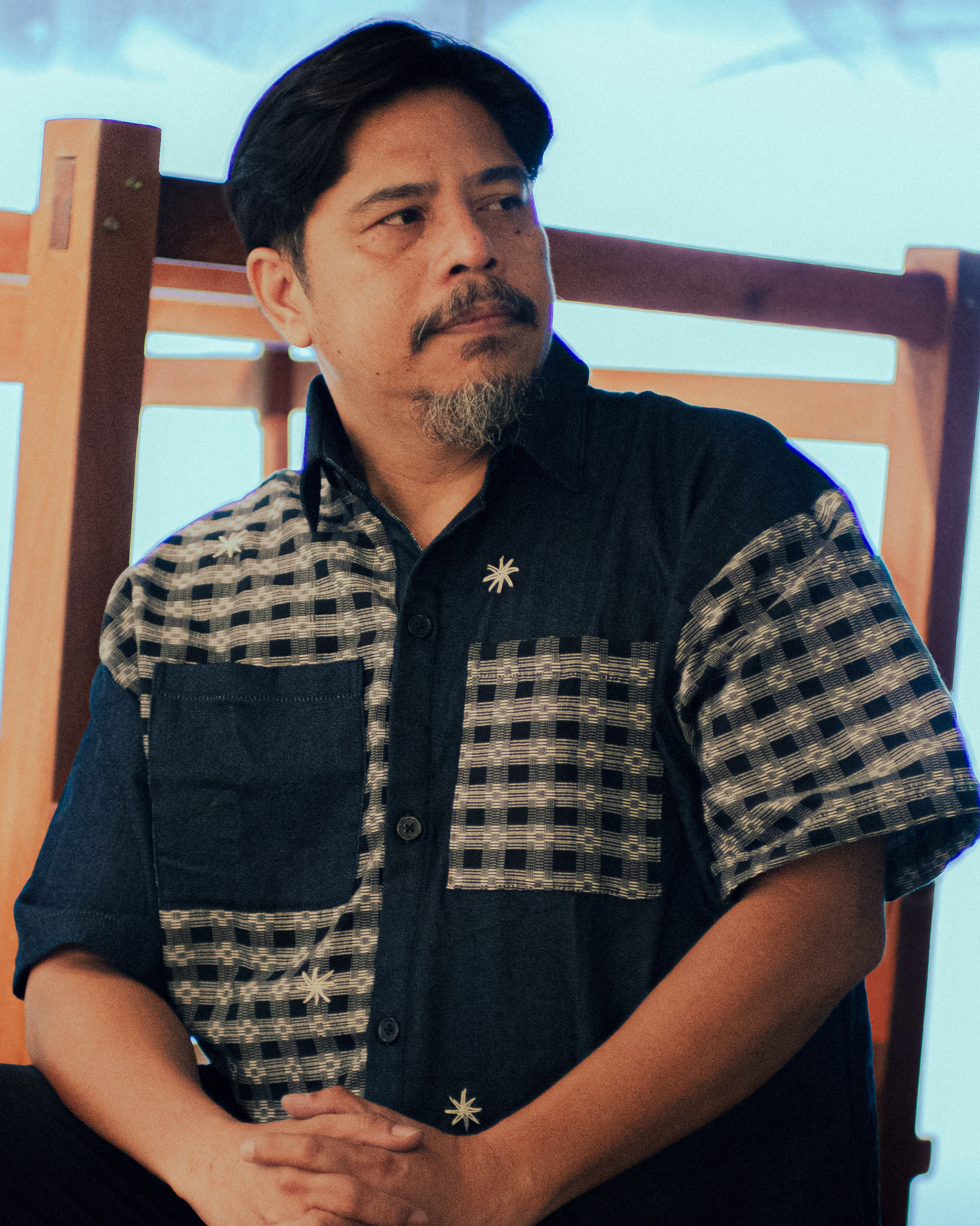 Worn by artist and cultural worker Jun Sabayton. Crafted with hand embroidery and detailed sewing, the Katipunan Button Down Oversized Shirt blends modern wearability with traditional artistry.
